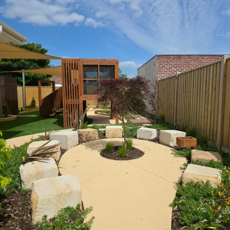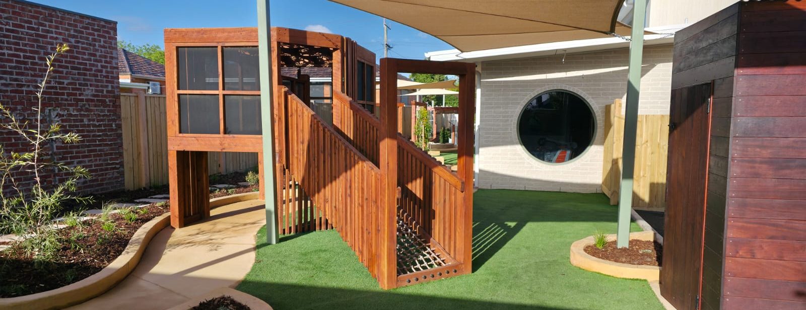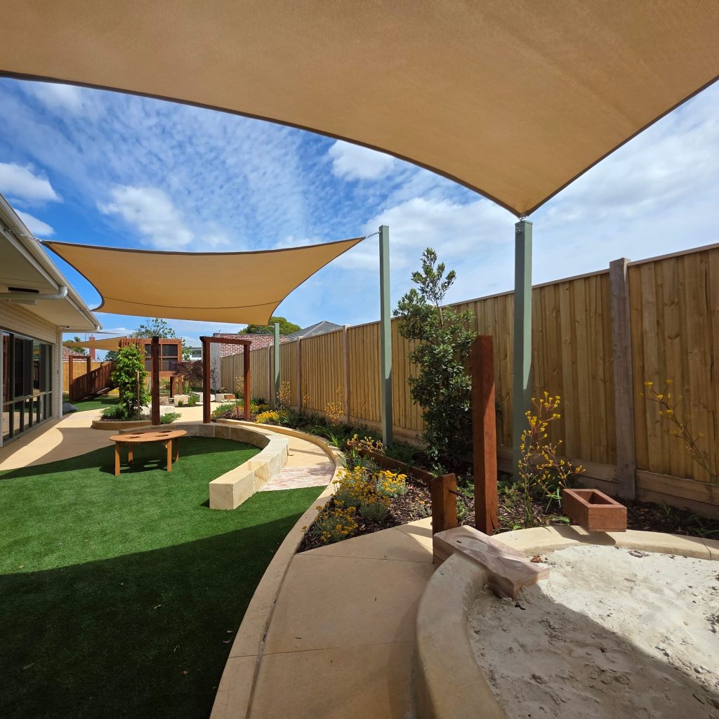 Delivered in close collaboration with the client, this project brings together custom timber play structures with slides and nets, a fabric sail roof, a repurposed vintage car for interactive play, and natural sandstone with concrete edging; creating an engaging playscape for children and families, with a result the client was delighted with.